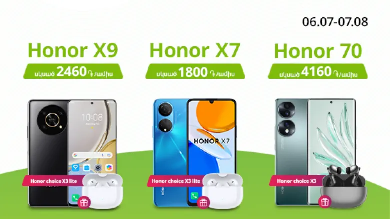 Հավելենք, որ նշված Honor սմարթֆոնները հնարավոր է ձեռք բերել նաև առցանց ապառիկ տարբերակով, մինչև 36 ամիս մարման ժամկետով։ Ապառիկ գնման դեպքում Honor X7 սմարթֆոնը հնարավոր է ձեռք բերել ամսական սկսած 1790 դրամից, Honor X9՝ ամսական սկսած 2460 դրամից, իսկ Honor 70 սմարթֆոնը՝ ամսական սկսած 4160 դրամից։