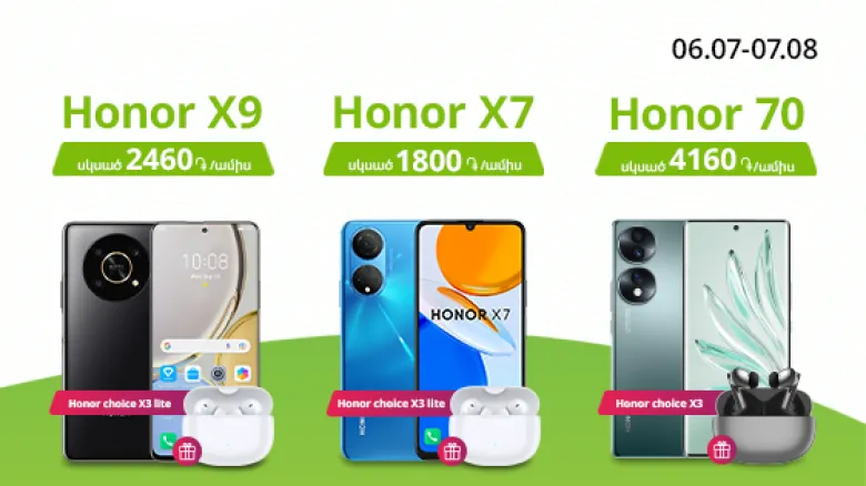 It's worth noting that Honor smartphones can also be purchased online on credit, with a repayment period of up to 36 months. With installment purchase, the Honor X7 starts from 1,790 AMD per month, the Honor X9 starts from 2,460 AMD per month, and the Honor 70 starts from 4,160 AMD per month.