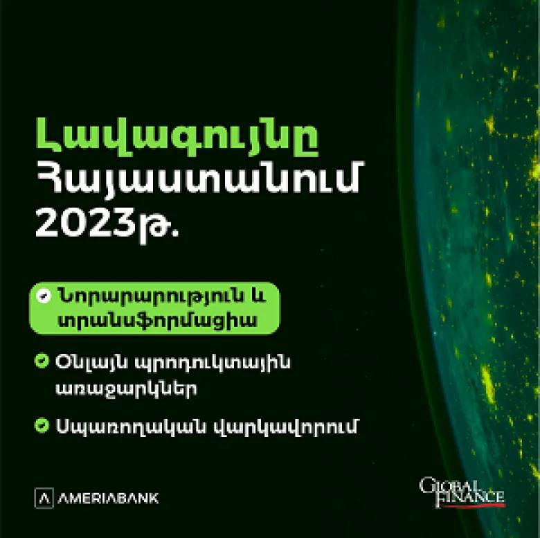 Ամերիաբանկն արժանացել է «Global Finance» միջազգային հեղինակավոր ամսագրի 3 մրցանակի «Աշխարհի լավագույն թվային բանկ» մրցանակաբաշխության շրջանակում, մասնավորապես` «Լավագույն նորարարությունը և տրանսֆորմացիան Հայաստանում 2023թ.», «Լավագույն օնլայն պրոդուկտային առաջարկները Հայաստանում 2023թ.» և «Լավագույնը սպառողական վարկավորման ոլորտում Հայաստանում 2023թ.»: