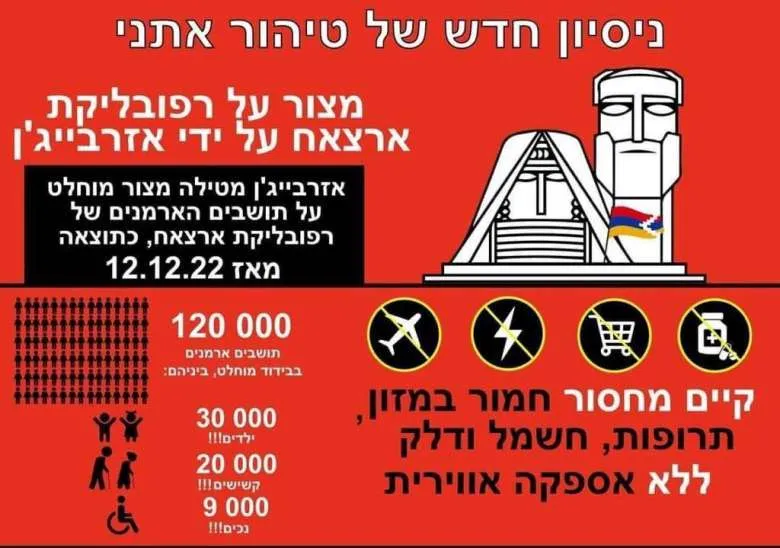 A rally to support the people of Artsakh (Karabagh) which are under the siege of Azerbaijan for several months so far with a huge lack of the necessary supplies and commodities. We are calling for the Israeli government and the international community to prevent the people of Artsakh from further isolation which causes victims and a humanitarian catastrophe. Jerusalem, 17th August, 11:00, Ministry of Foreign Affairs․