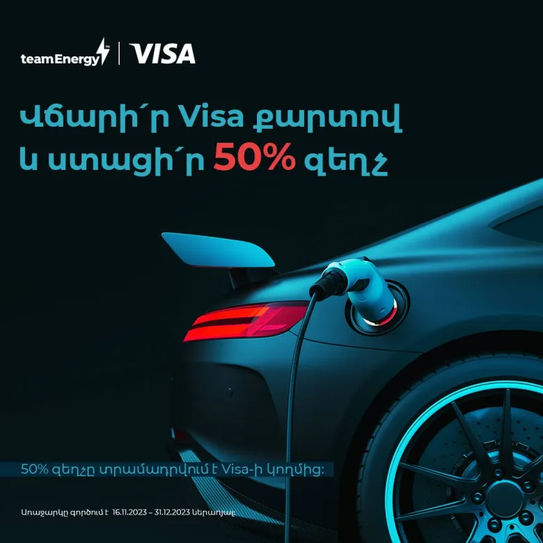 Team Telecom Armenia-ն և Visa-ն գրավիչ առաջարկ են ներկայացնում էլեկտրական մեքենաների վարորդների համար․ Team Energy էլեկտրական մեքենաների լիցքավորման կայաններում վճարումը Visa քարտով կատարելիս հաճախորդից կգանձվի գումարի 50%, իսկ մնացած կեսը կհատուցվի Visa-ի կողմից։