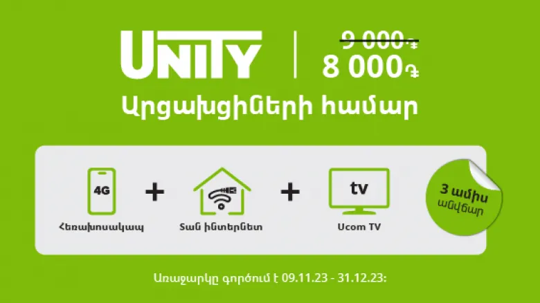 С искренней заботой и твердой приверженностью принципам социальной ответственности компания Ucom представила новое предложение для наших соотечественников, вынужденно переселенных из Арцаха. Абоненты, до 31-го декабря подключившие региональный тарифный план Unity 9000, предлагающий самый быстрый домашний интернет, смогут пользоваться услугой бесплатно в течение 3 месяцев, после чего стоимость услуг для них составит 8000 драм вместо 9000 драм. Тарифная линейка Unity – одно из самых выгодных предложений компании Ucom, включающее одновременно услуги мобильной связи, фиксированного интернета, пакет 210+ телеканалов и позволяющее пользоваться лучшими устройствами, обеспечивающими комфортную и стабильную повседневную связь.