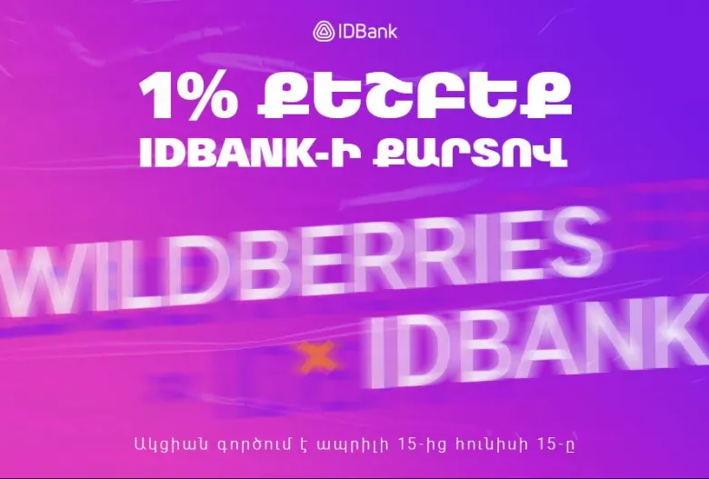 IDBank-ը սկսում է բացառիկ արշավ Wildberries հարթակում առցանց գնումների սիրահարների համար։ Այս տարվա ապրիլի 15-ից սկսած կատարե՛ք առցանց գնումներ Wildberries-ում, վճարե՛ք IDBank-ի քարտերով և ստացե՛ք մինչև 1% քեշբեք գնումների դիմաց։