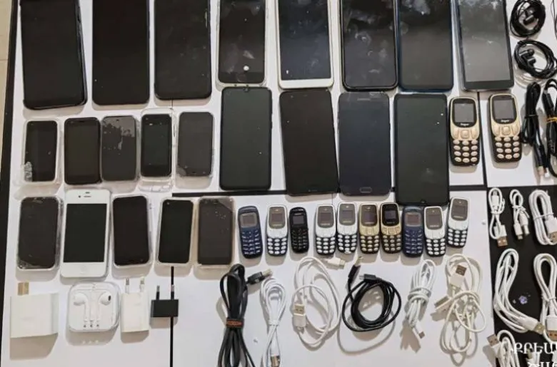 Զննությամբ ծառայողները սառնարանի վերևի հատվածում հնարամտորեն պատրաստված թաքստոցից հայտնաբերել են կպչուն ժապավեններով և շինարարական փրփուրով փաթեթավորված 34 բջջային հեռախոս, 30 USB լար, 5 ականջակալ, 5 բաժանորդային քարտ և լիցքավորման սարքի 3 գլխիկ։