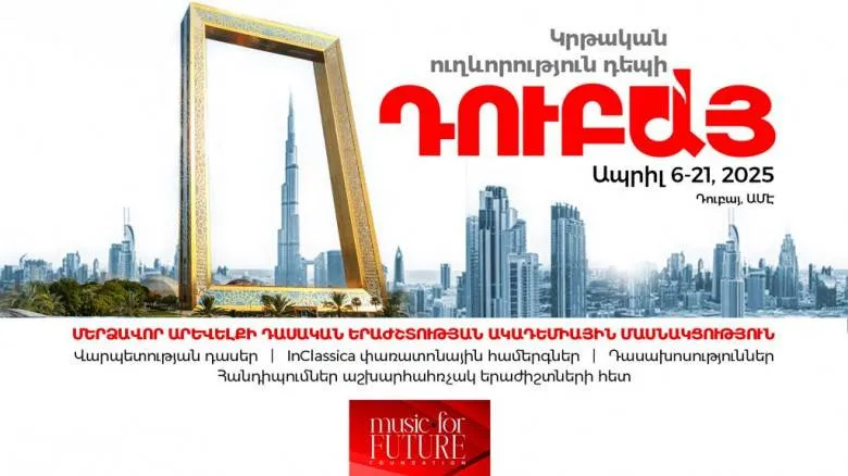 Մերձավոր Արևելքի դասական երաժշտության ակադեմիան «Երաժշտություն հանուն ապագայի» հիմնադրամի հետ միասին առաջարկում են ճանապարհորդության բացառիկ հնարավորություն: Հիմնադրամն արդեն երրորդ անգամ նախաձեռնում է «Կրթական ուղևորություն» դեպի Արաբական Միացյալ Էմիրություններ, մասնավորաբար՝ Դուբայ քաղաք՝ Մերձավոր Արևելքի դասական երաժշտության ակադեմիային (Middle East Classical Music Academy-MECMA) մասնակցելու նպատակով: Այն անցկացվելու է 2025 թ․-ի ապրիլի 6-ից 21-ը։ Հիմնադրամն Ակադեմիայի կազմակերպիչներից ստացել է բացառիկ առաջարկ Հայաստանի երաժշտական կրթօջախների սաների և ուսուցիչների համար:
