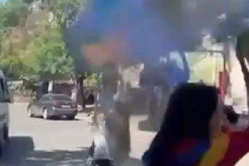 Բրյուսովի որոշ ուսանողները եռագույնը պատկերող ծուխ են արձակում ու միանում դասադո...